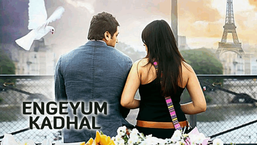 Engeyum Kadhal unfolds across locations in France and occasionally Italy granting the film its most memorable visual settings. Scenes are framed mainly in Paris with a few musical sequences shot in Santorini and New Zealand. The city locations serve as more than backdrops. They inform mood tonality and character relationships through open squares, streetscapes, and riverbank views. The visual narrative is heightened by how the setting frames intimacy, tension, and escape.